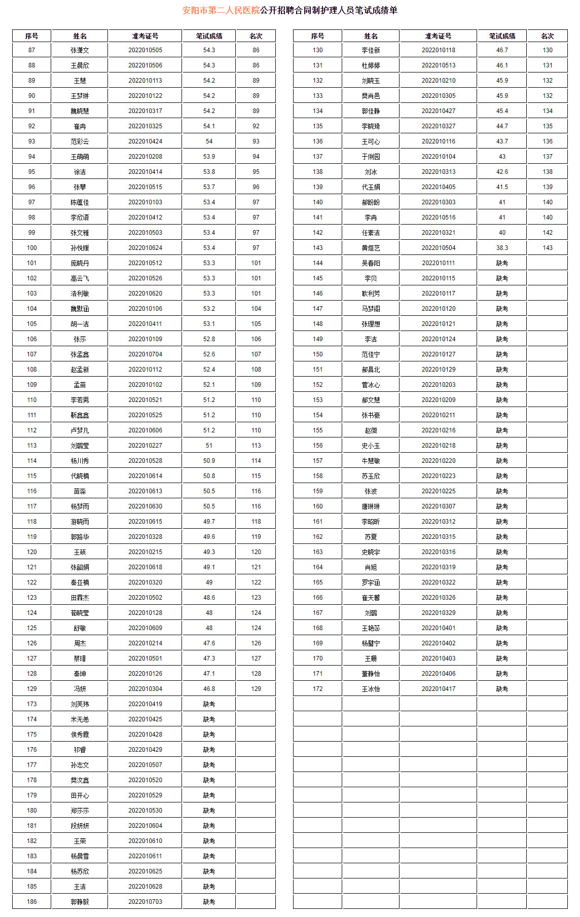 根據(jù)《安陽市第二人民醫(yī)院2022年公開招聘護(hù)理人員公告》有關(guān)規(guī)定,筆試工作已順利結(jié)束,現(xiàn)將筆試成績予以公布。