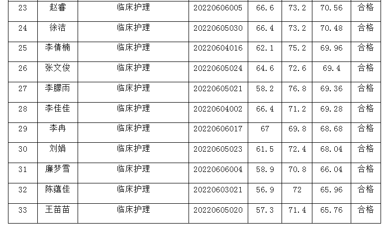 根據(jù)《安陽(yáng)市第二人民醫(yī)院2022年公開(kāi)招聘工作人員公告》有關(guān)規(guī)定,經(jīng)報(bào)名、資格審查、筆試、面試、體檢等程序,現(xiàn)將擬聘用人員公示如下,請(qǐng)以下人員于2022年7月21日上午8:00持本人有效身份證、畢業(yè)證書(shū)、學(xué)位證書(shū)(已取得資格證、執(zhí)業(yè)證的同時(shí)提交)到安陽(yáng)市第二人民醫(yī)院人事科報(bào)到。